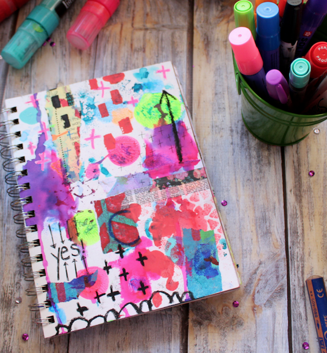 Art Journal Spread #2: Acrylics, Stenciling, Collage, Paint pens